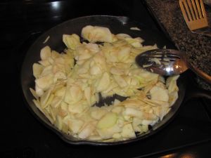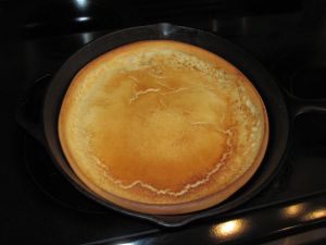 I expect that I have made this pancake at least 100 times. Sometimes with apples, sometimes with pears (or apples and pears), sometimes with blueberries and strawberries. Most often for breakfast and very occasionally as a dessert. The pancake batter is simple: 3 eggs, 3/4 c milk and 3/4 c flour and 2 T of sugar. After melting a couple of tablespoons of butter in a cast iron pan, add the batter, then bake for 15 minutes at 425 and 10 more minutes at 350. A common past frustration is that about ten minutes into things, bubbles will form and I have to keep poking holes with a fork to keep my pancake from becoming a very odd souffle. And despite my cast iron pan being pretty well seasoned, there are occasional sticking problems. This often requires me to curse.
